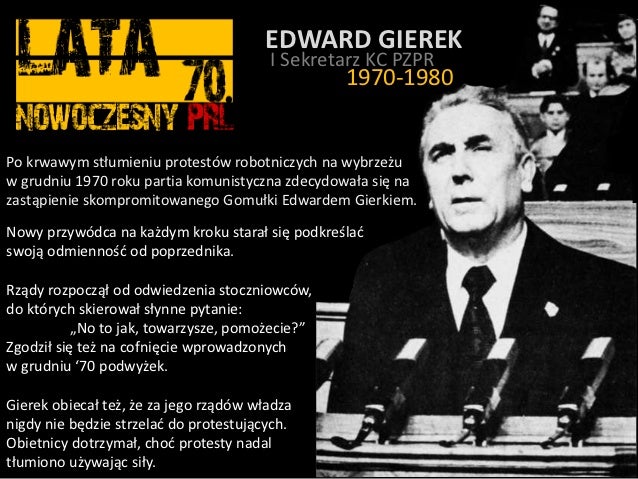 Wywarł dominujący wpływ na powojenne dzieje naszego kraju. I sekretarz kc pzpr edward gierek i premier piotr jaroszewicz przybyli, 24 stycznia, na wybrzeże, do szczecina, by spotkać się ze strajkującymi robotnikami stoczni im. Proszę zresztą zobaczyć ile ugrał edward gierek przy takiej postawie z moskwą a ile gomułka. Edward gierek (porabka, polonia, 6 de enero de 1913 29 de julio de 2001) fue un dirigente comunista polaco. Między wschodem a zachodem to tytuł najnowszej wystawy, którą od 8 marca można oglądać w sosnowieckim.